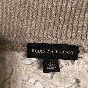 Rebecca Elliot white lace bomber jacket with light gray ribbed cuffs, collar and bottom edge. Gold front zipper. Bilateral front lower pockets with rubbing trim. Size medium. NWOT