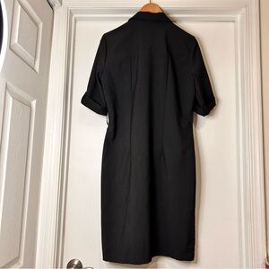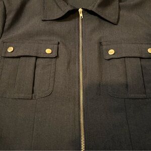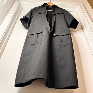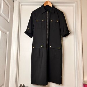 Classic black utility dress with a refined, tailored fit and striking gold hardware throughout. Designed with a front zip closure, short sleeves, and clean pocket detailing for a sophisticated yet modern edge.