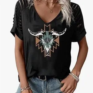 Chic black V-neck top featuring a striking bull skull graphic and sleeves with slits. Ideal for casual wear.