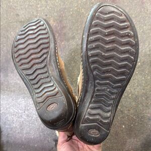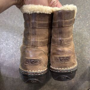 Stylish UGG boots with cozy shearling lining. Tan leather exterior. Perfect for cold weather.