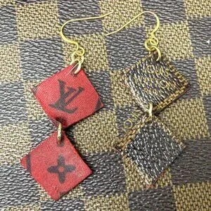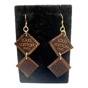 Luxury reimagined. These stunning dangle earrings are handcrafted from authentic French designer signature canvas, rescued and transformed into wearable art. Featuring elegant gold-tone 925 sterling silver hooks, these lightweight statement pieces blend sustainable luxury with timeless style.