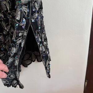 80s VINTAGE | Iridescent Black Sequined Beaded Floral V Neck Sheath Dress Large