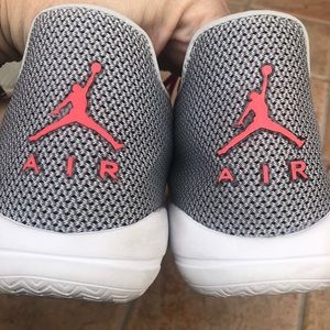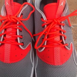 Stylish Nike athletic shoes. Gray mesh upper with vibrant red accents. Comfortable and durable design.