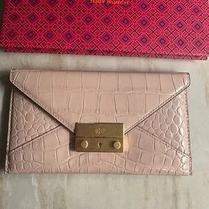 Never Used, With Tag. Tory Burch Juliette embossed envelope wallet in clay pink is the perfect gift for others - or yourself! This wallet has a section for 6 credit cards and two pocket sections for cash, notes etc. A must have accessory for your wardrobe without paying full price. Included is the Tory Burch shopping bag - they’ll never know you found this on Poshmark and for such a great price!