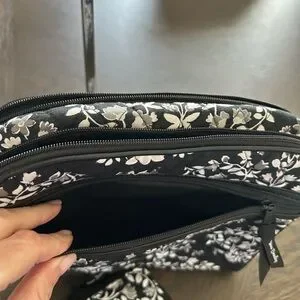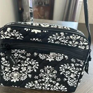 Quilted Vera Bradley crossbody with matching wallet. Black background with white and gray floral print. Adjustable strap and front zip pocket. Lightweight and easy to carry. Classic floral pattern for everyday use.