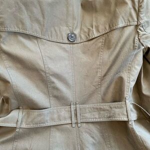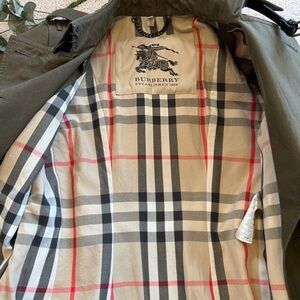 Sophisticated olive trench coat by Burberry. Features a double-breasted front and belted waist. Skinny black belt around the collar and wrists.