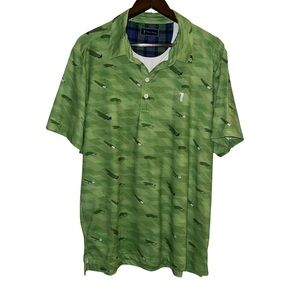 Details:• Brand: William Murray Golf• Size: Large• Color: Green• Short sleeve polo• All-over golf course shadow print• Embroidered logo on chest• Script logo on back collar• Performance stretch fabric• Lightweight / breathable