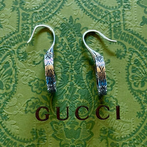 Elevate your look with timeless Gucci drop earrings featuring the iconic interlocking G logo in antiqued silver-tone. Ideal for making a statement with luxury and style. These Gucci earrings come with the original Gucci green box and dust bag.