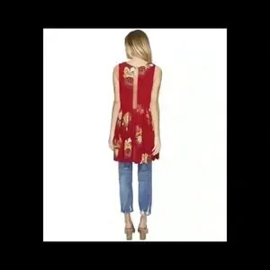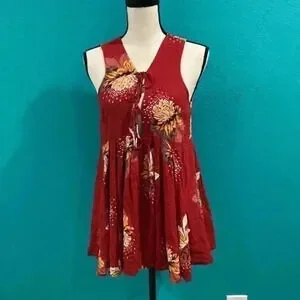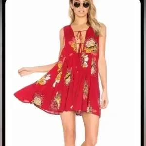 Free people lovely day tunic mini dress in red floral pattern. With a plunging neckline and 2 front ties. Has a cute keyhole back. In size xs.