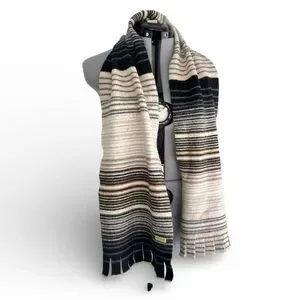 Beautiful Echo striped scarf in soft neutral tones of cream, gray, tan, and deep navy with subtle ombré shading and fringe trim. Crafted from a cozy wool blend featuring 70% lambswool, 20% angora, and 10% nylon, giving it a warm, lightweight, and slightly fuzzy texture that’s perfect for fall and winter layering. Long rectangular shape allows for versatile styling—wrap, drape, or knot for an effortlessly polished look. Neutral color palette pairs easily with coats, sweaters, and everyday outfits.