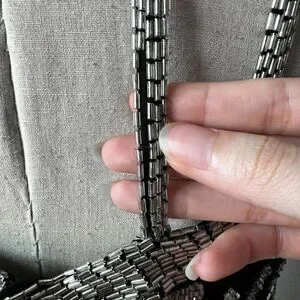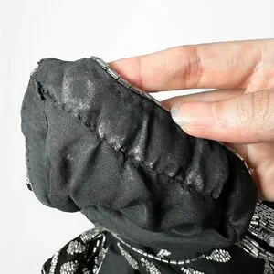 Pre-loved. Good. Sign of wear. Small spot with separation in the fabric, some missing beads/loose threads and stain in inside lining