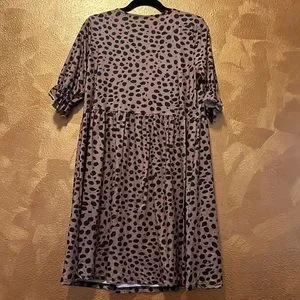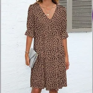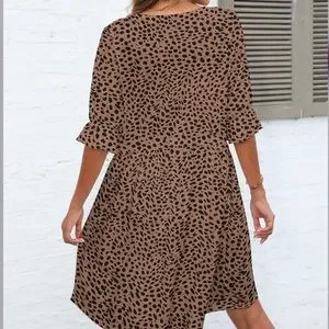 Tan & Black Speckle animal Print Ruffle-Sleeve Surplice Dress