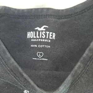The Hollister Crop Top Graphic Print T-Shirt in size L features a solid black color with a round neck and short sleeves, making it ideal for casual and travel occasions. Made of 100% cotton, this t-shirt is machine washable and lightweight, providing comfort and breathability for the warmer seasons of summer, fall, and spring. With a relaxed fit and cropped style, this grunge-themed top from Hollister is perfect for juniors looking to add an edgy touch to their wardrobe.