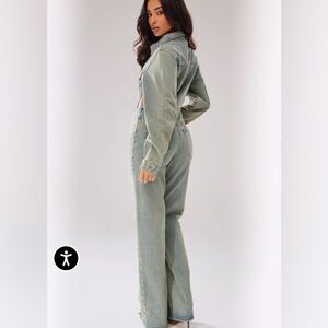 Stylish green denim jumpsuit. Features front pockets and distressed knees. Perfect for casual outings.