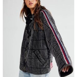 Free People Dolman quilted knit jacket in "sports rib", black with red, white, and blue varsity stripes on the sleeves; oversized slouchy fit with zip front, side pockets, and rib trim, women’s size large, new without tags.