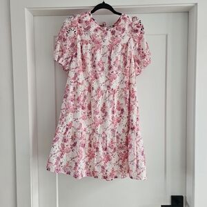 Greylin Pink Floral Eyelet Puff Sleeve Tiered Midi Dress Romantic Cottagecore L