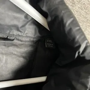 Tags and identifiers: Interior neck label lists size XXL and Made in China; interior care/content label notes nylon shell and lining with down/feather insulation.