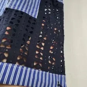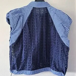 NWT. Stylish blue striped women's top with a unique design. Perfect for casual outings. Can be cinched at waist. Functional pockets. Functional buttons but it doesn’t open up all the way down as the hem doesn’t have opening. Super cute.