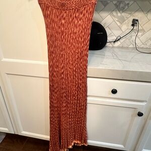 Stylish maxi skirt with a textured comfy design. Perfect for casual or dressy occasions. Please note mild signs of wear near bottom, reflected in photo and pricing.