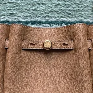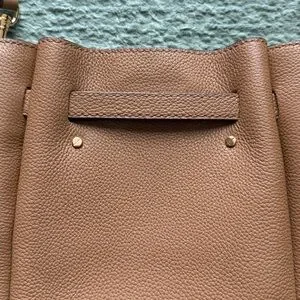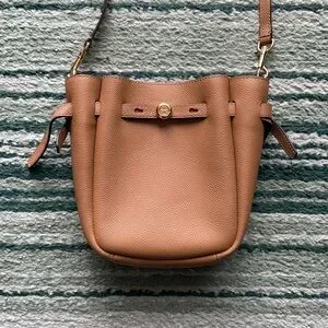 Tory Burch small Romy crossbody. Color: Tiramisu. Pebbled leather small crossbody bucket bag with suede interior. Magnetic closure and drawstring detail. Gold plated hardware with Tory Burch logo on front. Small logo on one side strap. Adjustable strap. Three interior slip pockets for cards and IDs. Measures about 7.5 inches high, about 6 inches wide (bottom), about 8 inches wide (top), and about 2 inches deep. Does NOT come with dust bag. Excellent used condition.❗️Sorry, I do not trade.❗️