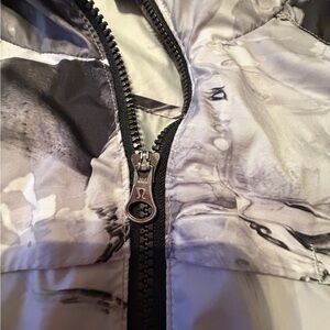 Stylish hooded jacket with an abstract black and white design. Features a full zip front and side pockets.