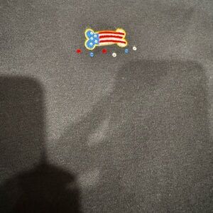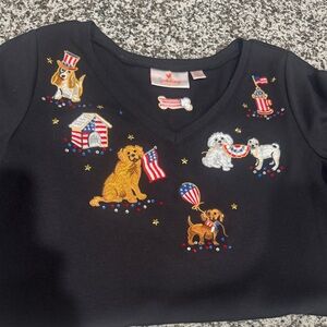 Charming black tshirt with festive dog designs. Features patriotic theme with flags and stars.