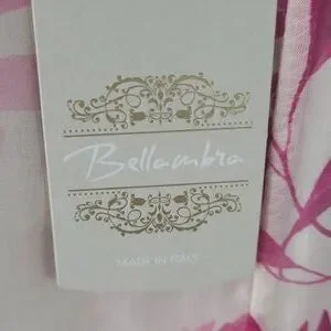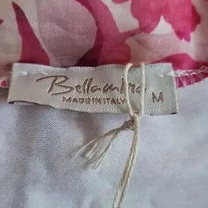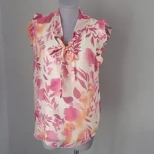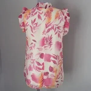 Bellambra floral print blouse in shades of pink, orange, and white. U neckline with a tie closure. The sleeves are short and ruffled. The overall style of the blouse is feminine and delicate. Viscose and silk blend, fully lined. Made in Italy.