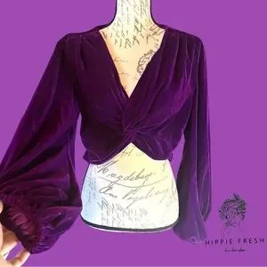 Elegant purple velvet blouse. Features long, flowing sleeves. Stylish twist front design.