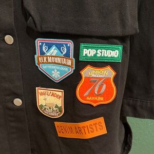 Stylish black jean jacket adorned with vibrant patches. Perfect for adding a unique touch to your wardrobe. Button up. Two chest button flap pockets on breast. Slight slits on lower sides. Never worn just no tags.