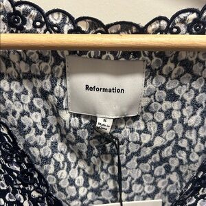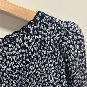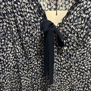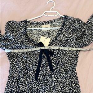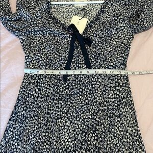 Stylish mini dress with floral design. Features a bow accent and three-quarter sleeves.