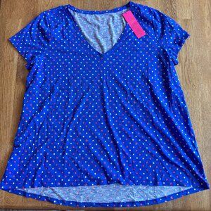 Lilly Pulitzer Etta patriotic top. Stock photos provided for style and fit reference. So cute! Definitely gives me Fourth of July/patriotic vibes with the red, white, and blue pattern! Would be perfect for Memorial Day, 4th of July, and just summer in general :) Brand new, tags still attached. Size large. definitely seems that it is meant to have a more oversized/relaxed fit. 100% cotton.