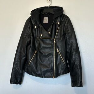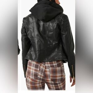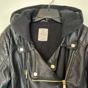 Free People black vegan leather look Jealousy Leather Moto hooded Jacket…
