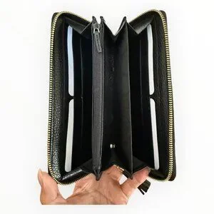 A classic Gucci piece featuring the iconic Soho embossed interlocking GG logo in beautifully grained black leather. This zip-around wallet is both elegant and highly functional, offering generous interior organization while maintaining a sleek, timeless silhouette. Finished with signature gold-tone hardware and the recognizable leather tassel zipper pull, this is one of Gucci’s most loved wallet designs.