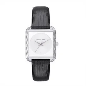 Elegant Michael Kors dress watch featuring a square case framed with pavé crystals and a sleek black leather strap.