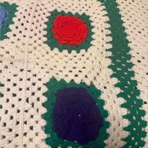 vintage handmade 3D rose granny square afghan. These crochet blankets are characterized by their white base, green "leaf" borders around each square, and raised, colorful floral rosettes.