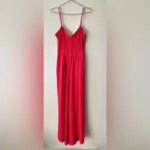 Crop length jumpsuit. Thin Spaghetti straps. Pockets. Hidden back zipper. Beautiful button down front. Floral embroidery trim on chest.