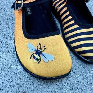 Adorable honeycomb + bumblebee print flats with striped detailing and buckle strap. Super whimsical cottagecore vibes.