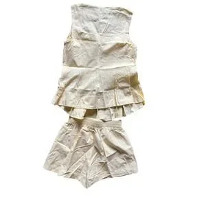 Sunshine on a cloudy day, this adorable two-piece set brings a playful and chic vibe to your wardrobe. The sleeveless top features delicate pleats that cascade down the front, creating a flattering and flowy silhouette. The matching shorts offer a comfortable elastic waistband for easy wear. A hidden zipper in the back of the top ensures a seamless fit. This set is perfect for a casual brunch with friends, a sunny day at the park, or a relaxed vacation getaway.