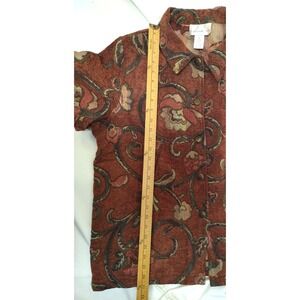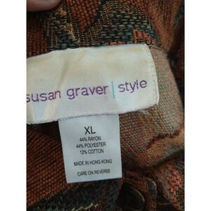 This women's Susan Garver style unlined tapestry type fabric jacket in size XL features a colorful design with bronze color metal buttons. Made from a blend of rayon, polyester, and cotton, this basic jacket is perfect for adding a pop of color to any outfit. The regular fit and unlined construction make it comfortable and versatile for everyday wear. Perfect for women who appreciate unique and stylish outerwear pieces.