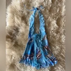 Crafted from printed mesh fabrication and fully lined for comfort, this mini dress features a statement plunge halter neckline adorned with cascading flounces, exuding effortless allure. A delicate mesh floral appliqué at the bodice adds a feminine touch, while the ruched hip seam and tiered flouncy skirt create movement with every step. The backless design is finished with neck and back tie closures, ensuring a flattering, adjustable fit.