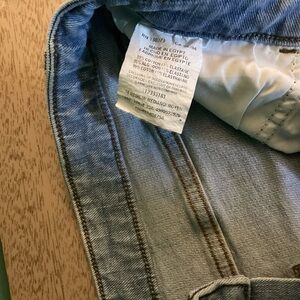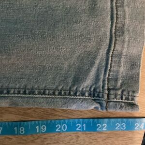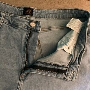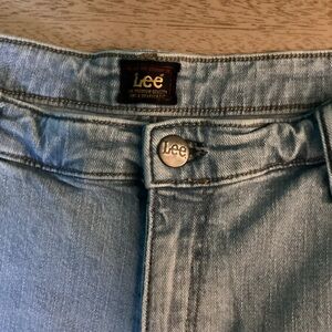 These are a size 18 medium Lee denim capris. They are in a light wash color and are made of 99% cotton and 1% elastane. They have the classic five pocket design.