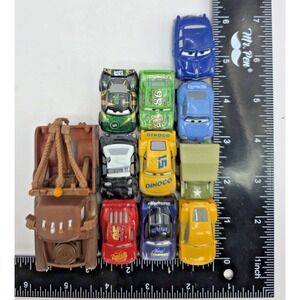 This includes a lot of 10 Cars the Movie diecast cars, mini racers. Five cars are from 2016 and 5 cars are from 2017. No duplicates. Also includes a regular size Tow Matter vehicle 3.25" long. The mini racers are about 1.5 inches long. All of the cars are in good condition, some have some paint rubbed off. Please see photos.