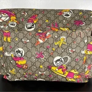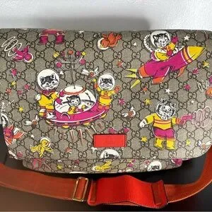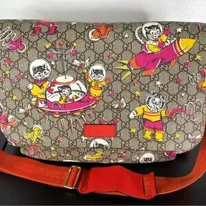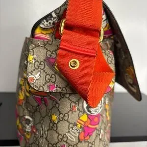 Stylish Gucci baby bag with playful print. Features vibrant colors and adjustable strap. Perfect for on-the-go parents.