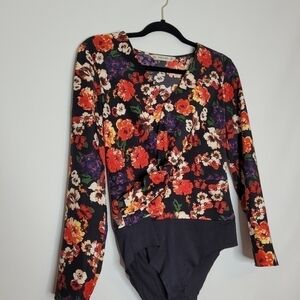 Very pretty floral and black body suit. Wear with jeans, slacks and skirts depending on your style! Your can even wear this under a blazer or cardigan to add a professional touch.