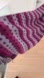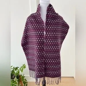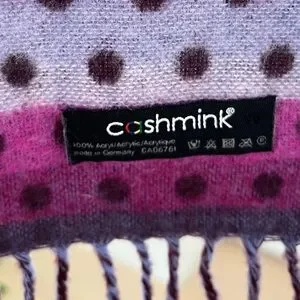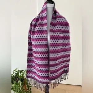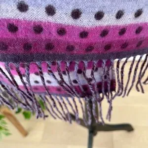 Cashmink winter scarf in purple polka dot in stripes pattern. Reversible. One side is lighter purple and the other side is darker purple. Fringe on short ends. Cashmink is 100% acrylic made in Germany.