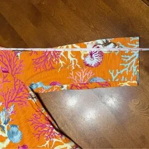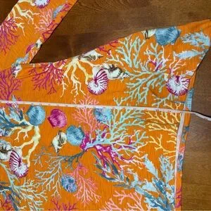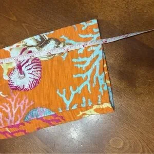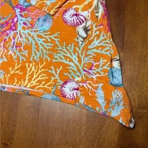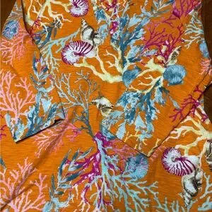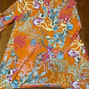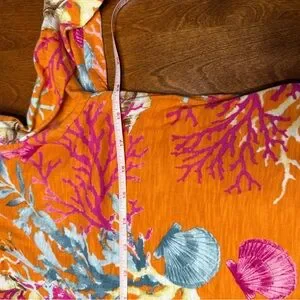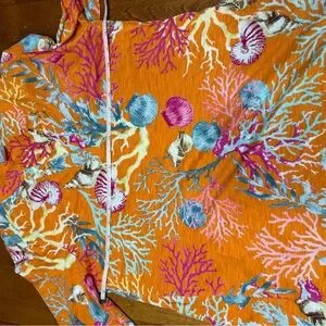 Orange top with vibrant pink and blue patterns. Features unique coral design.