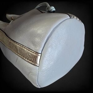 Stylish Rebecca Minkoff mini bucket bag crafted from soft smooth leather with a striking snake-embossed front panel. This chic drawstring crossbody features polished gold-tone hardware and a modern bucket silhouette that is perfect for everyday wear.
