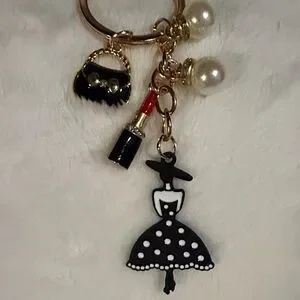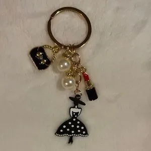 Chic and stylish keychain featuring a black and gold design with elegant pearl accents. Perfect for adding a touch of sophistication to your accessories.
