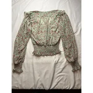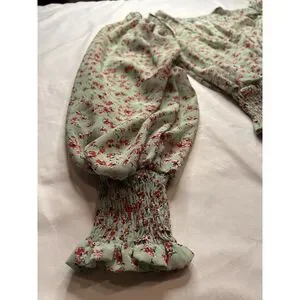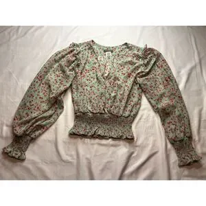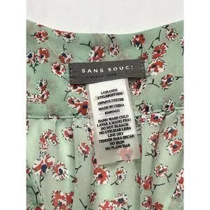 This Sans Souci blouse is the perfect addition to your wardrobe this spring! The floral pattern and ruffle accents add a touch of preppy charm, while the sheer material and V-neckline create a stylish and comfortable fit. The button closure and size L make it easy to wear and perfect for any occasion. The green color is a great way to incorporate a pop of color into any outfit. Get ready to turn heads with this unique and fashionable blouse!