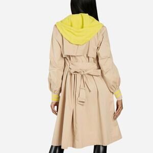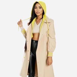 Brand new and effortlessly stylish tan trench coat featuring a bold attached yellow zip-front hoodie for a sporty, street-chic vibe. Designed with eye-catching yellow outer snaps and adjustable front tie to customize your fit. Lightweight yet structured, making it perfect for layering through multiple seasons.